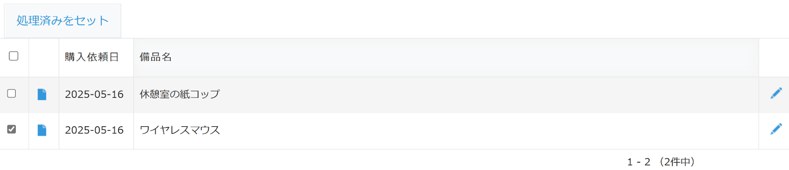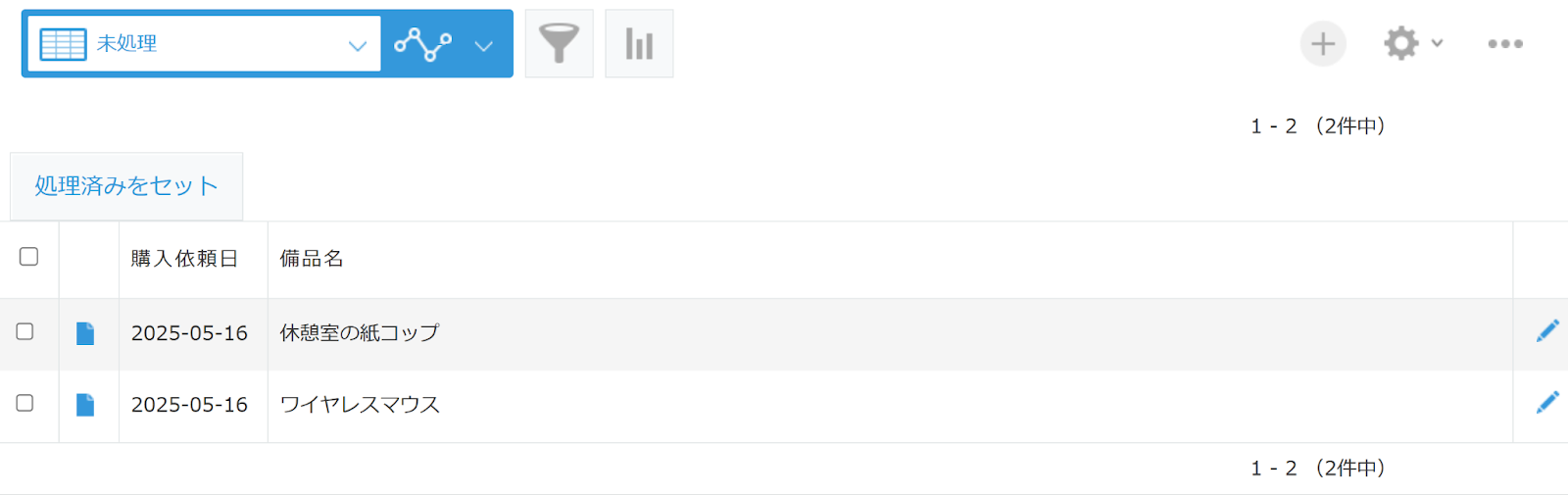 すると、「ワイヤレスマウス」のレコードが「処理済」になり、一覧画面に表示されなくなります。
