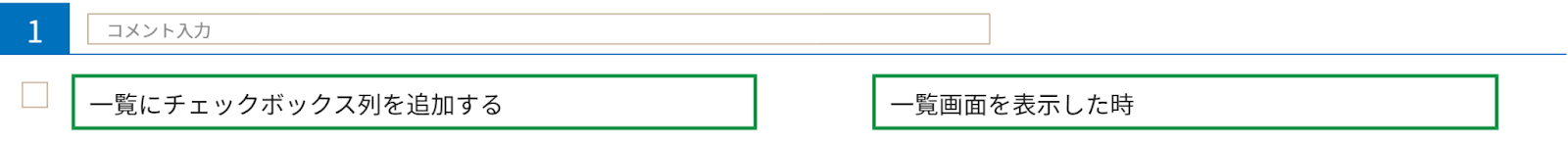 やること「一覧にチェックボックス列を追加する」、条件「一覧画面を表示した時」を用います。