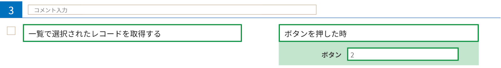 やること「一覧で選択されたレコードを取得する」、条件「ボタンを押した時」を用います。