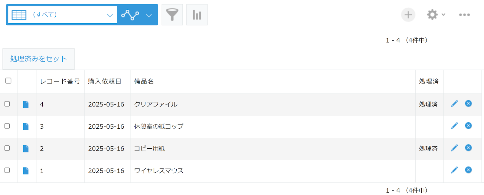(すべて)の一覧でレコードを表示すると、処理済2件、未処理2件のレコードが登録されています。