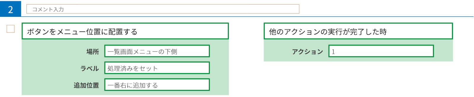 やること「ボタンをメニュー位置に配置する」を用います。なお、「場所」は「一覧画面メニューの下側」、「ラベル」は「処理済みをセット」としています。