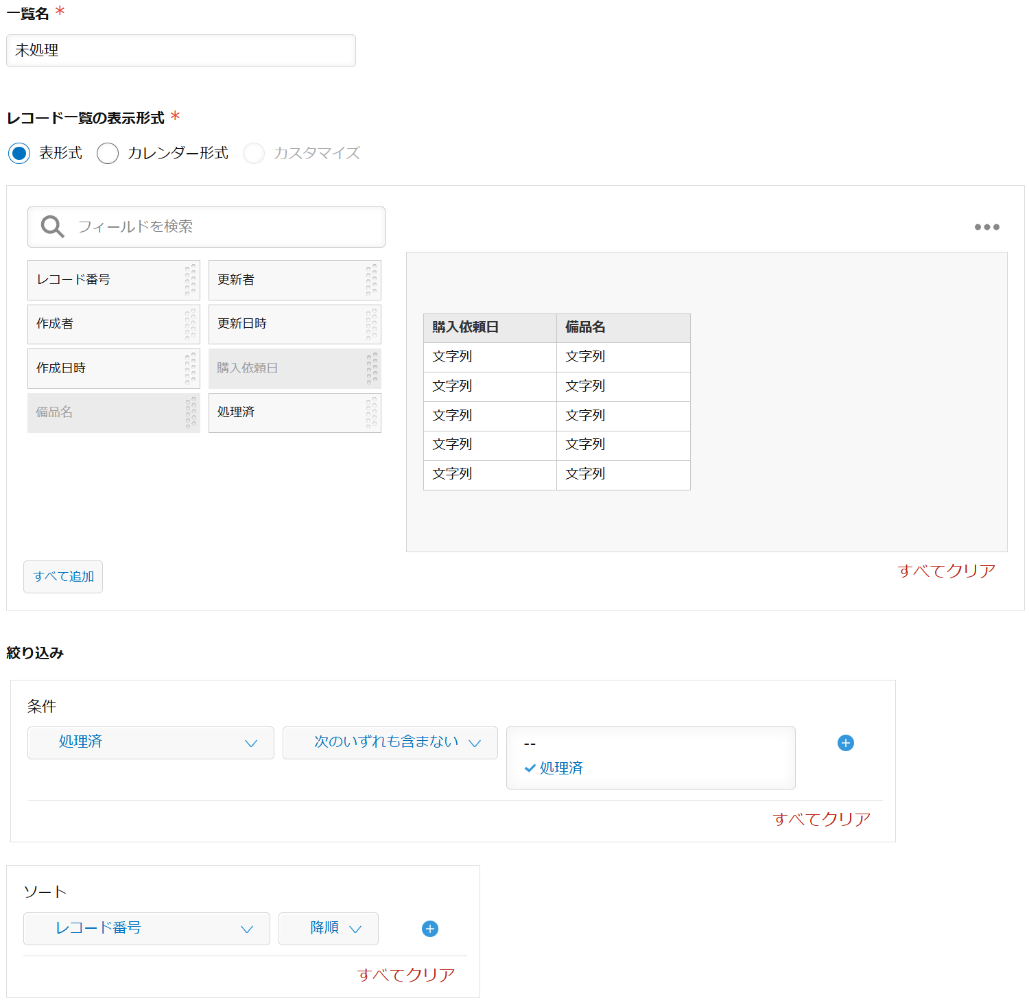 更に、一覧の絞り込み条件に「処理済」のものは表示しないように設定しておきます。