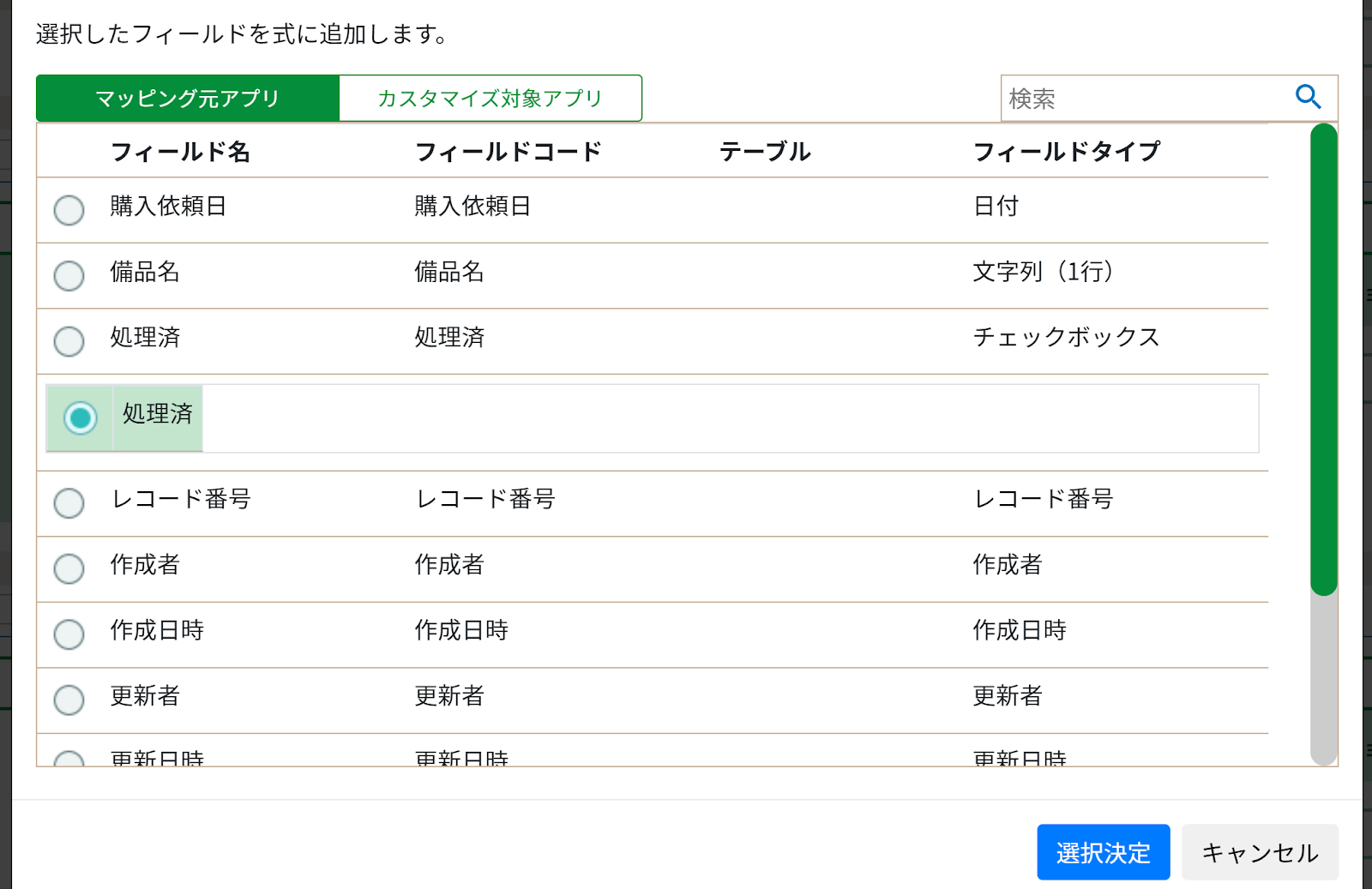 すると、「処理済」フィールドの中に「処理済」があるので、これをクリックし、「選択決定」をクリックします。