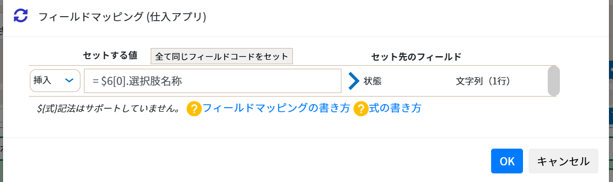 ポップアップで選択されたアクション6番のレコード中の、「選択肢名称」というフィールドの値をセットする内容です。