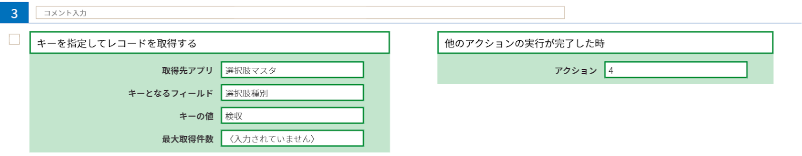 やること「キーを指定してレコードを取得する」で選択肢マスタアプリからレコードを取得します。この時キーとなるフィールドは「選択肢種別」を指定し、キーの値には「検収」を指定します。
