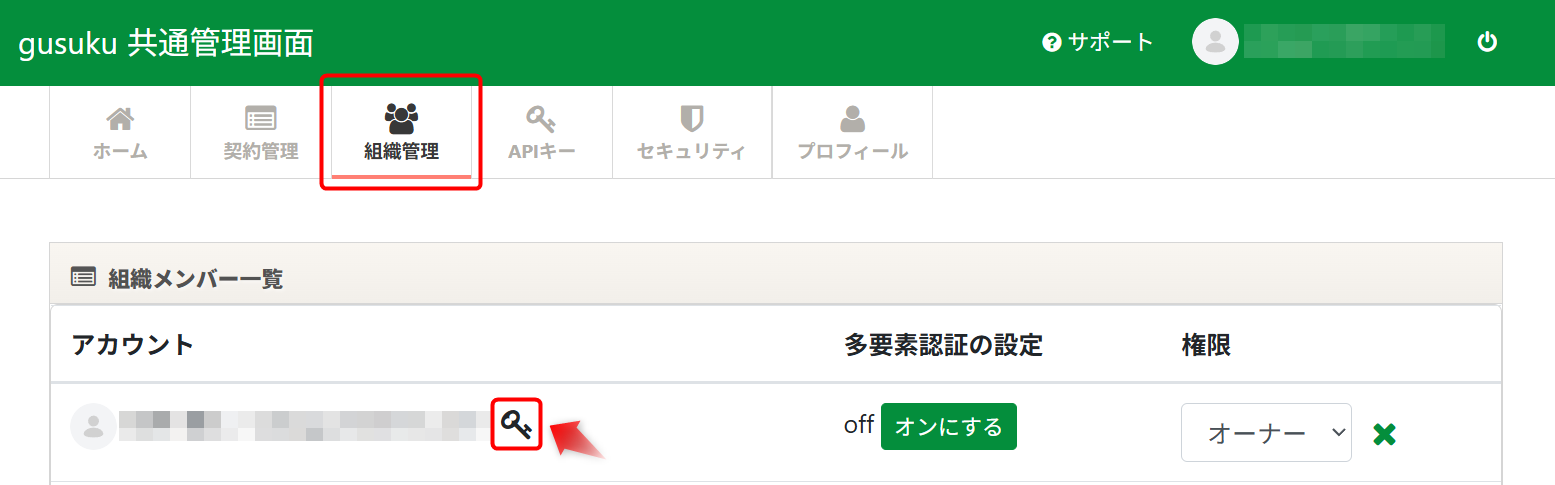 組織管理画面の鍵マークからもパスワードの変更が可能です。