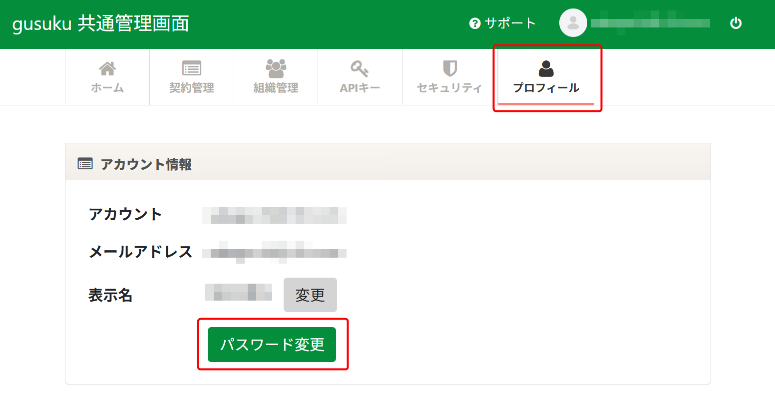 gusukuアカウントのパスワードは、gusuku 共通管理画面 のプロフィール画面で変更できます。