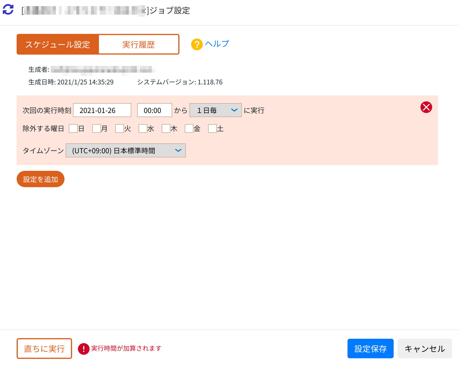 「設定を追加」をクリックすると、定期実行のスケジュールを設定することが可能です。スケジュールは複数設定可能です。