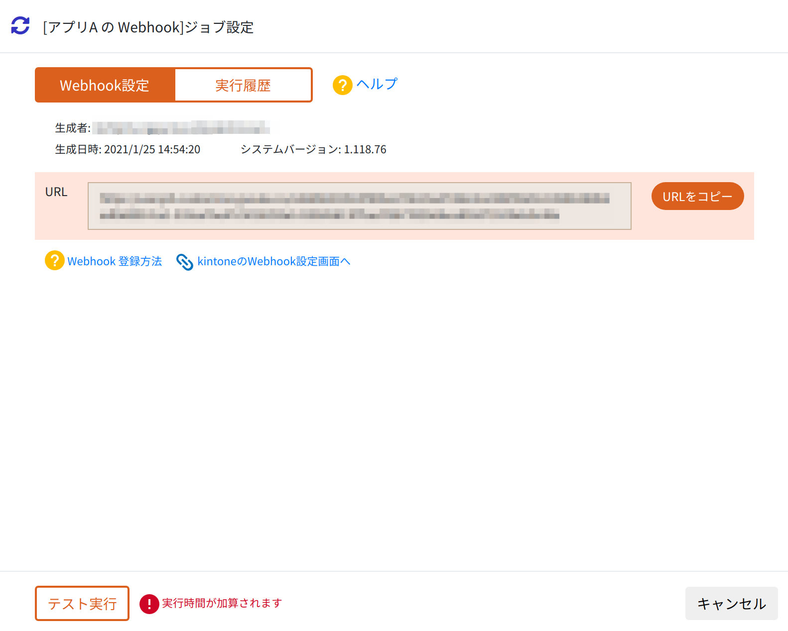 「URLをコピー」をクリックすると、kintoneのWebhook設定画面にセットするためのURLが、クリップボードにコピーされます。