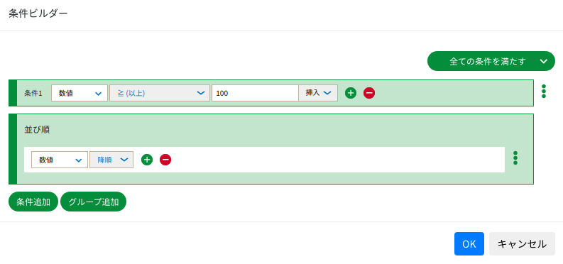 次の条件ビルダーに示す例では、数値フィールドの降順で設定しています。