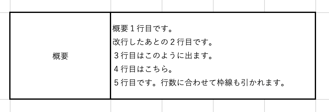 この際、セルの書式設定で「折り返し」の設定をしておくと、文字列(複数行)内の改行も反映されます。