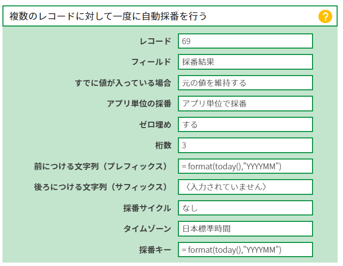 たとえば下記の例では、「前につける文字列(プレフィックス)」と「採番キー」に「= format(today(),"YYYYMM")」と指定することで、