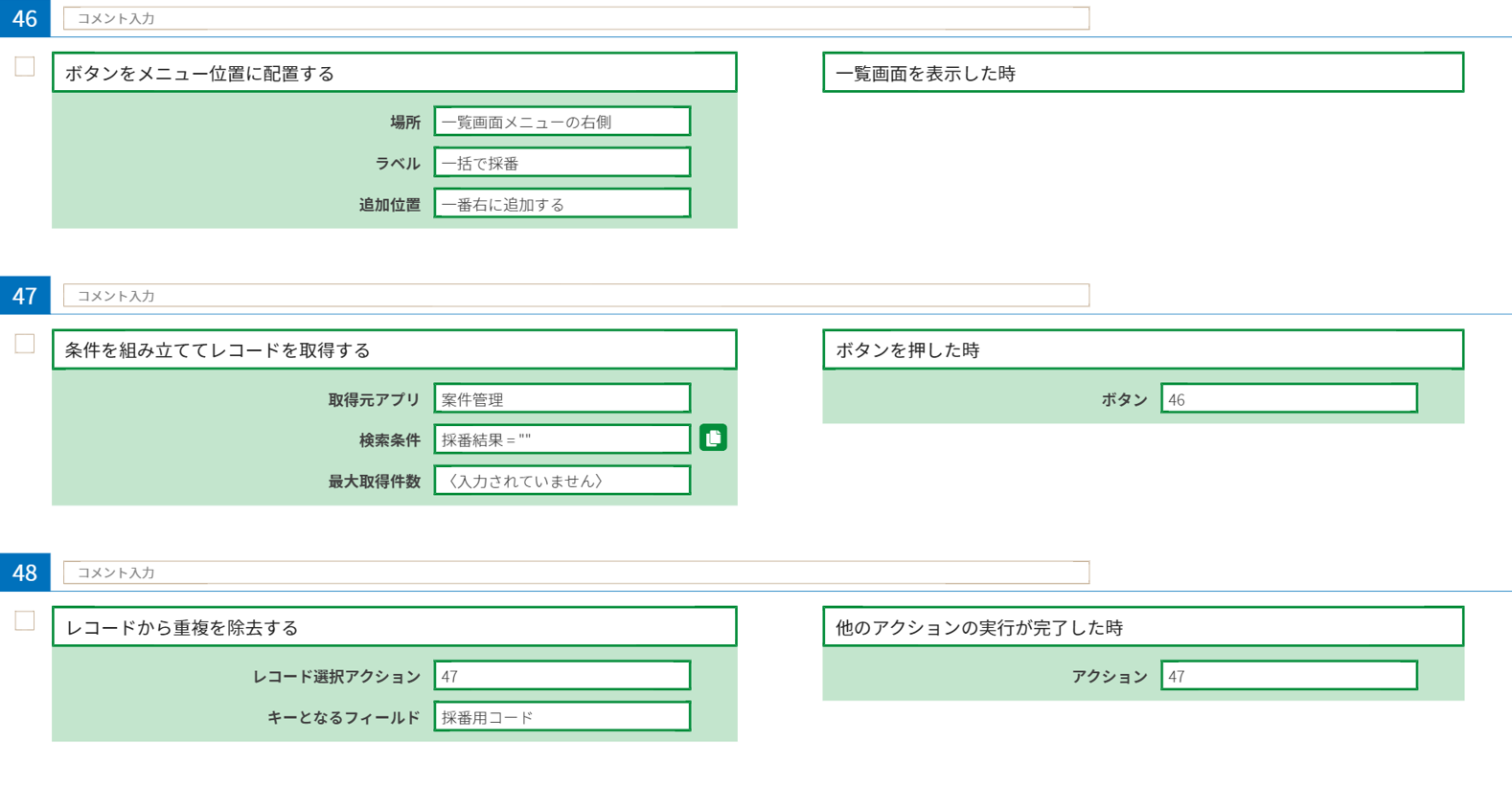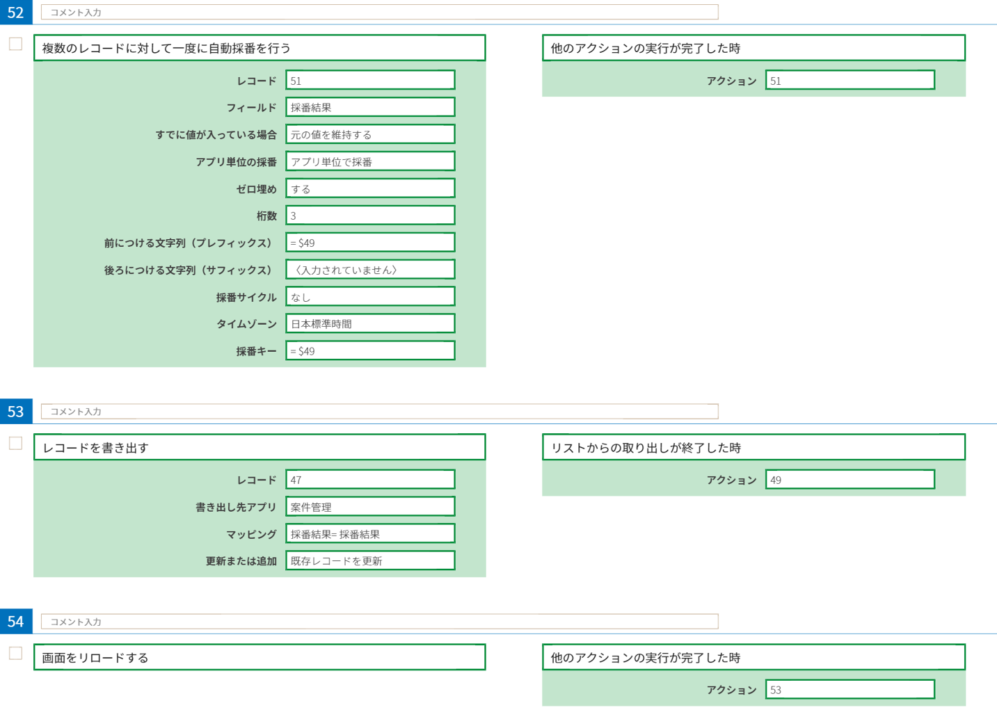 これは、やること「複数のレコードに対して一度に自動採番を行う」を実行しただけでは採番結果がkintoneに反映しないため、必ずこのアクションを作成します。