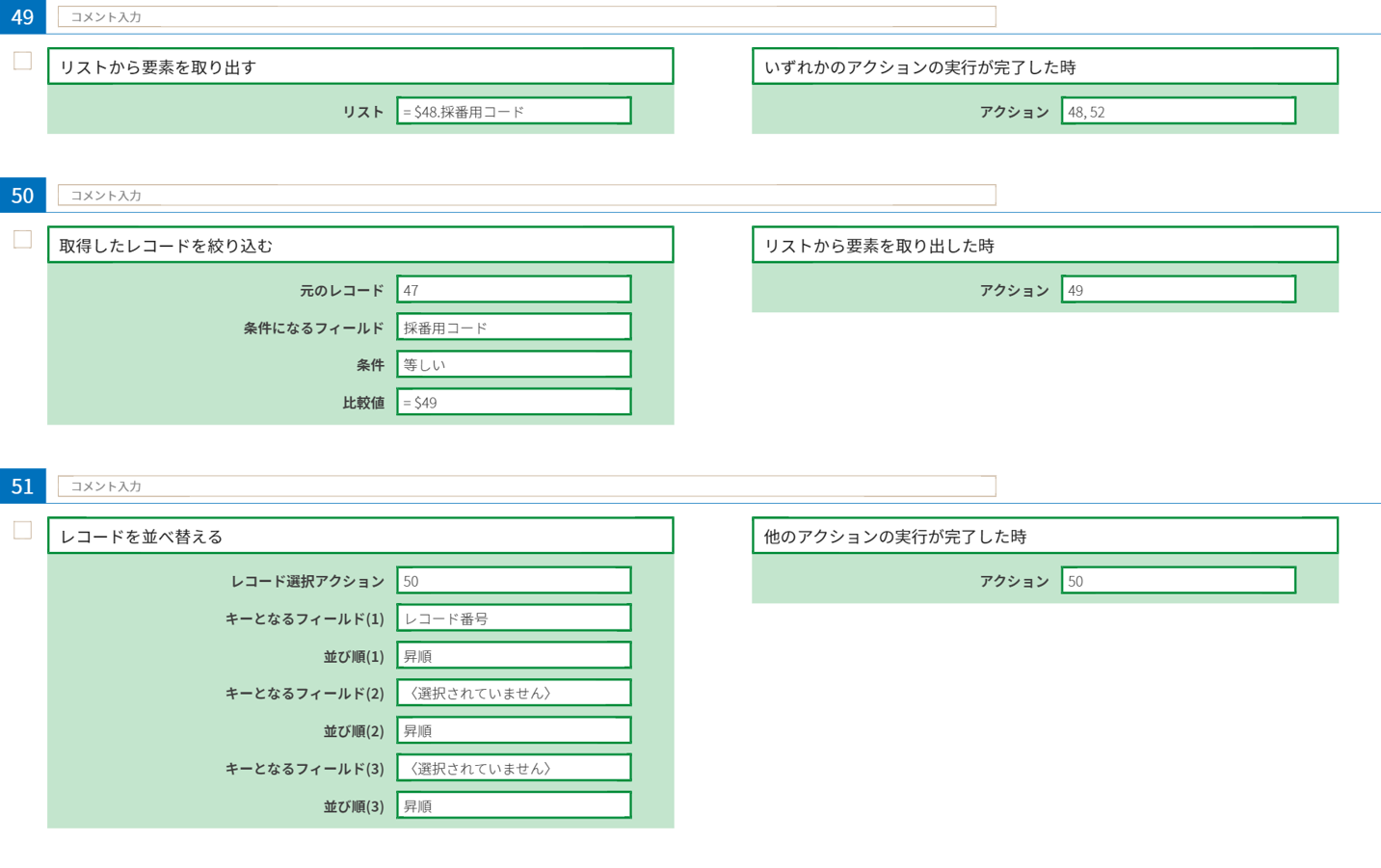 アクション51は「レコードを並べ替える」で、採番したい順番にレコードを並べ替えます。