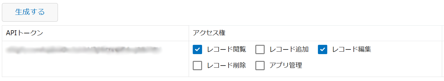 また、今回のカスタマイズを実行するためにはkintoneアプリにAPIトークンを設定しておく必要があります。次のように設定しておいてください。