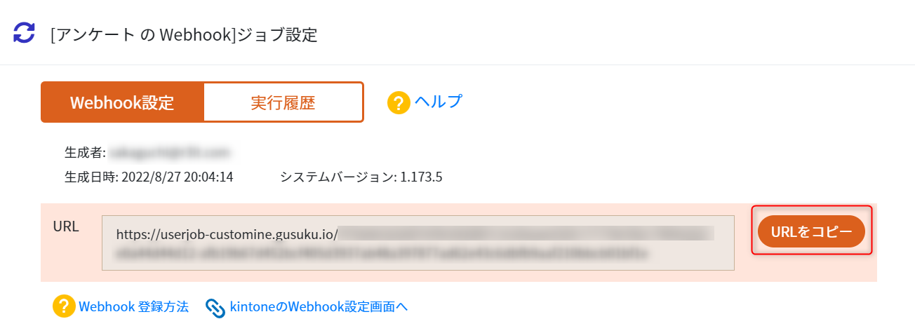 カスタマインの「ジョブ生成・設定」ボタンを押し、ジョブ設定画面に表示された URL をコピーします。