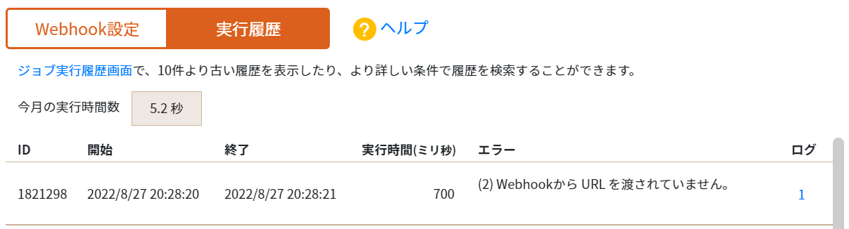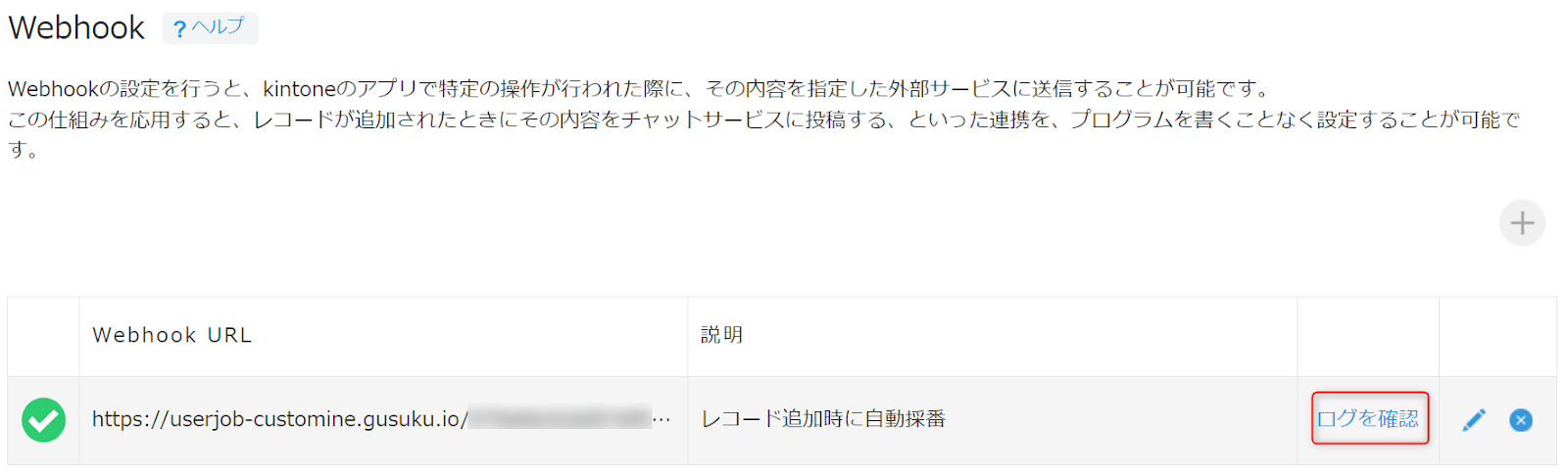 もしこの Webhook ログ の画面に記録がない場合は、kintone の Webhook の設定が誤っているか、または kintone の仕様により Webhook の通知が発生しない操作を行ったため、発生しなかった可能性があります。