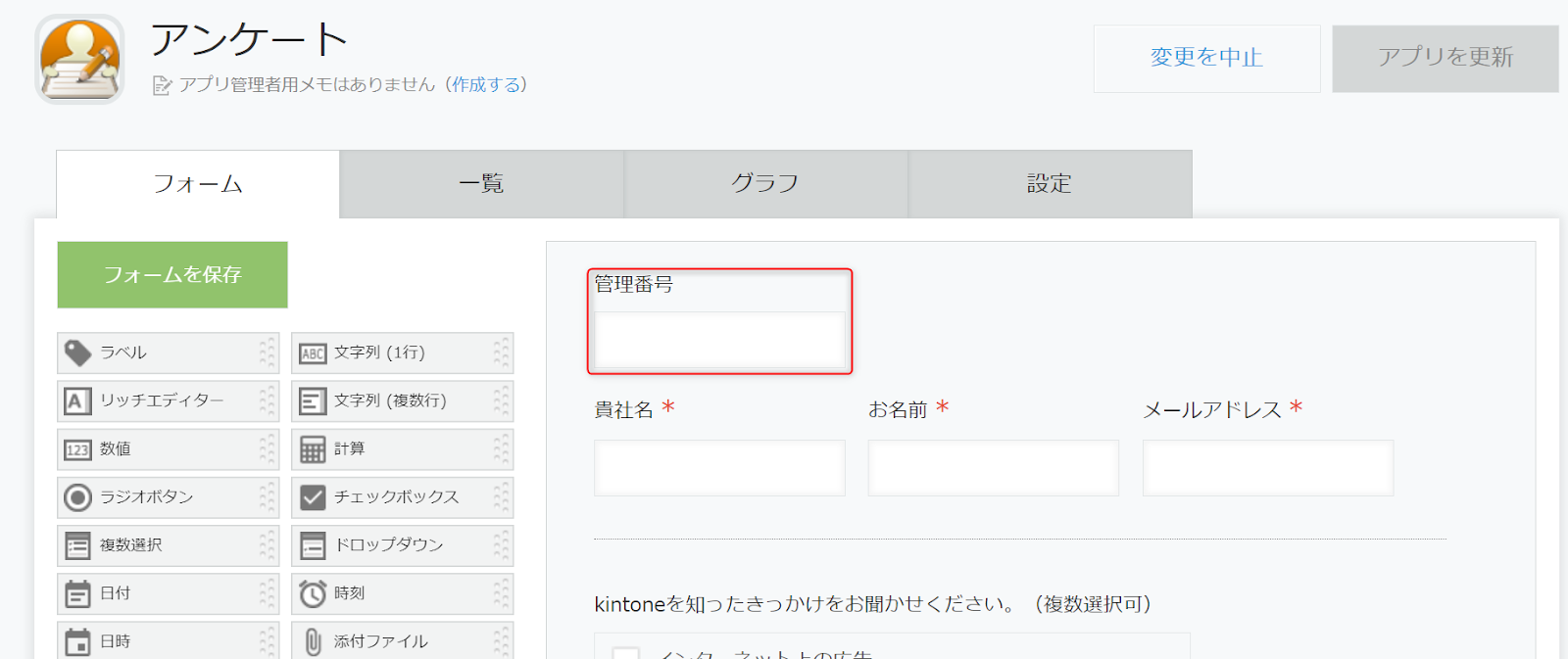 アンケートごとに重複しない採番結果を保存するための「管理番号」フィールド(文字列(1 行)) を追加します。