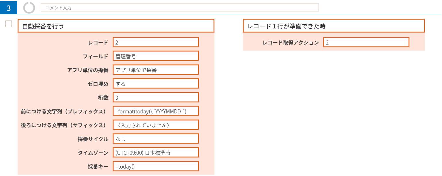 やること「自動採番を行う」は、パラメーター「フィールド」に指定したフィールドに採番結果をセットしますので、やることひとつで処理結果の反映も完了します。