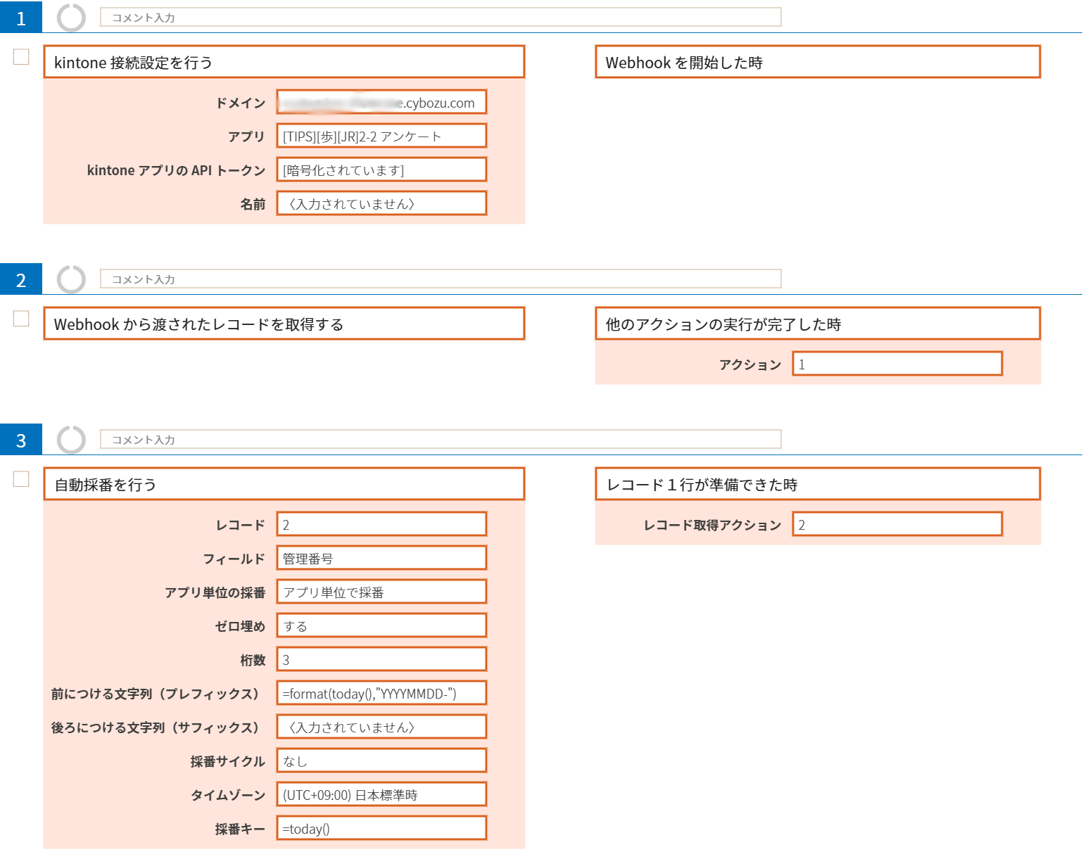 ただ可能なのはあくまで通知の発生元となったレコードの閲覧だけですので、レコードの更新を行う場合はやること「kintone 接続設定を行う」で接続する必要があります。発生元となったレコード以外のレコードを取得・更新する場合や、もちろん他のアプリのレコードを扱う場合も同様にやること「kintone 接続設定を行う」で接続が必要です。