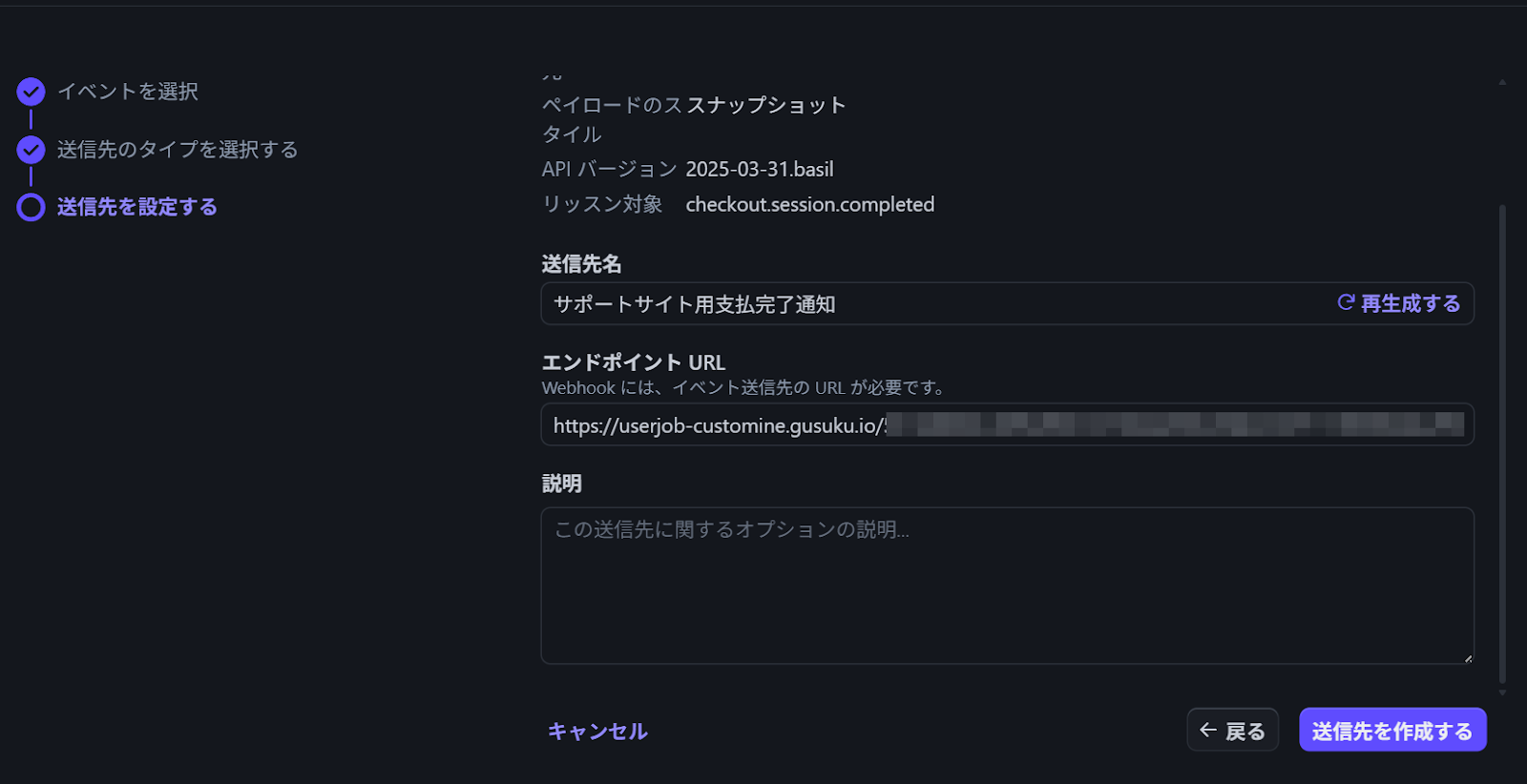 次に、カスタマインによって生成された URL を Stripe に登録し、Stripe からの Webhook の通知先としてカスタマインを登録します。
