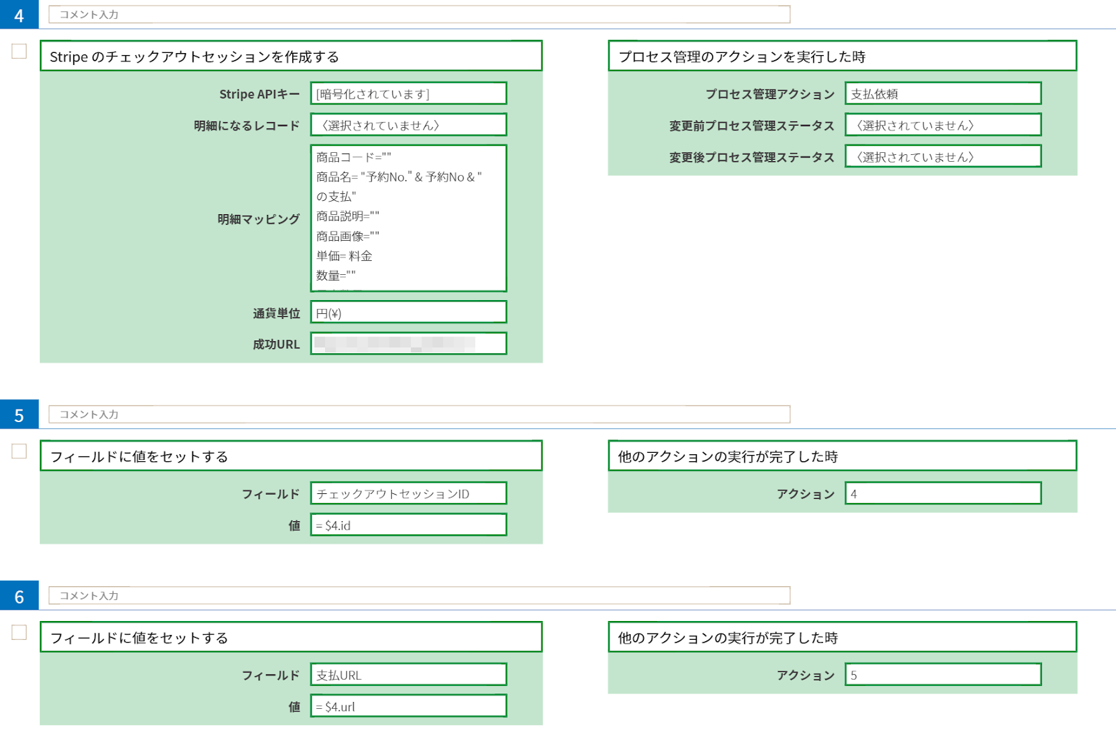 kintone の プロセス管理 のアクション「支払依頼」が実行されたらチェックアウトセッションが作成されるように設定します。