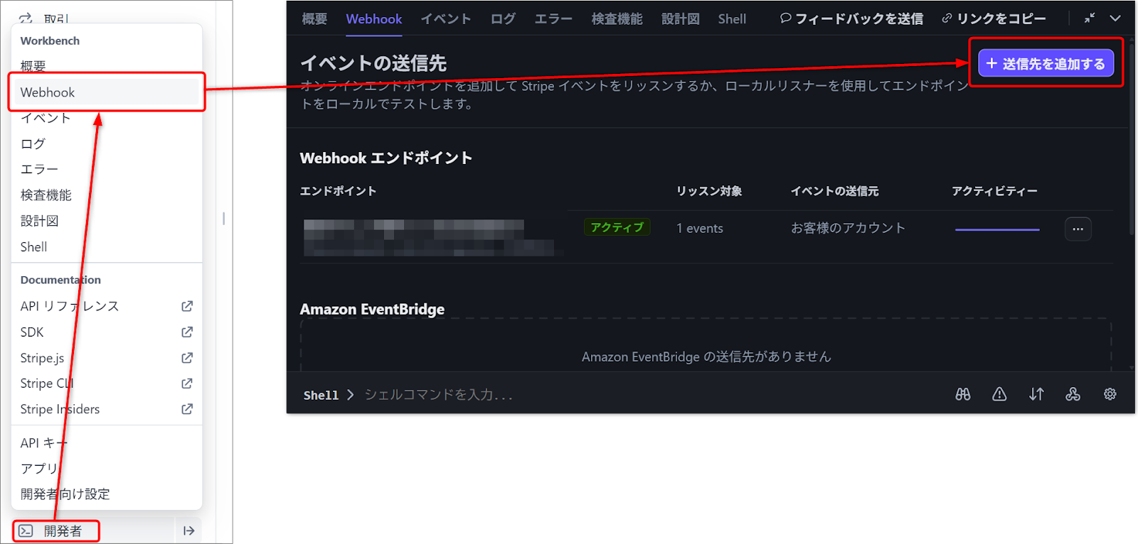Stripe の画面を開いて、コピーした URL を Webhook の通知先として登録します。