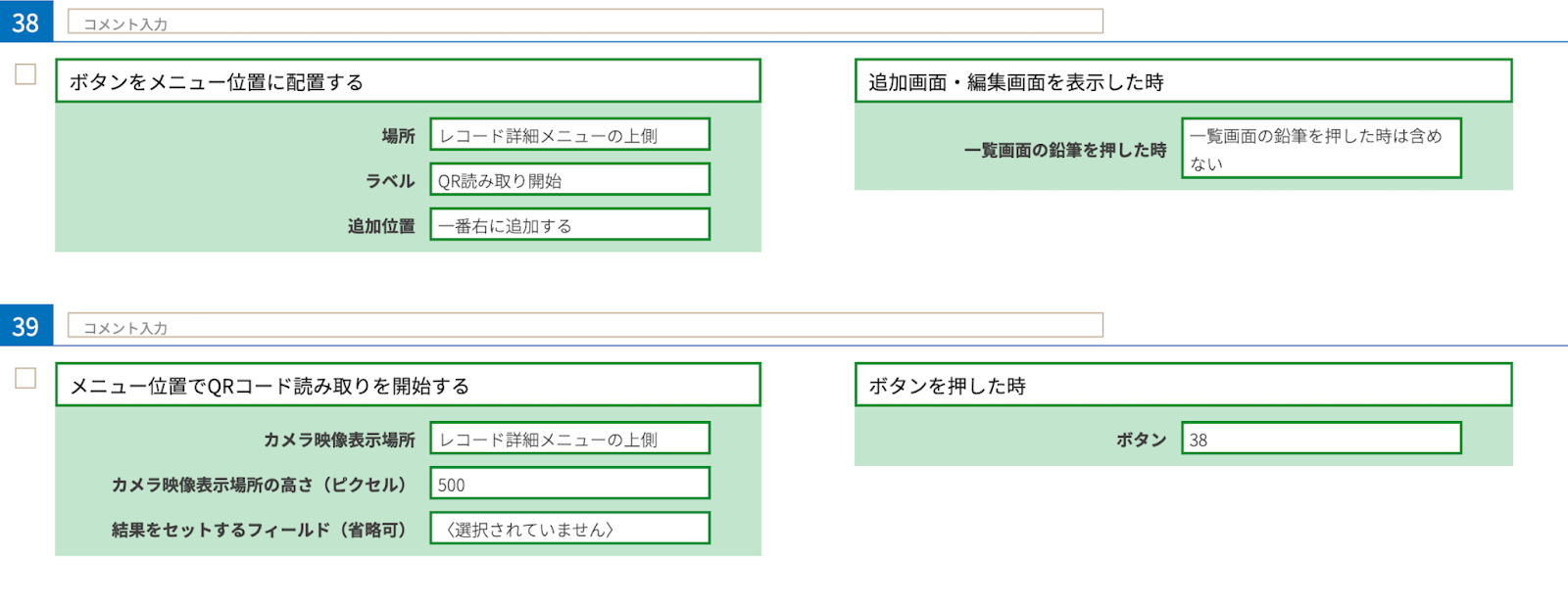まず、実行用のボタン設置と、ボタンを押したときにやること「メニュー位置でQRコード読み取りを開始する」を行います。