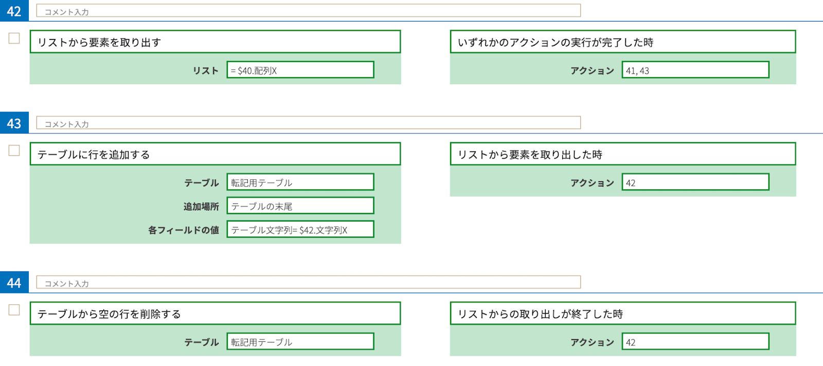 その後、41番のアクションでテーブル外のフィールドに読み取った値をセットします。