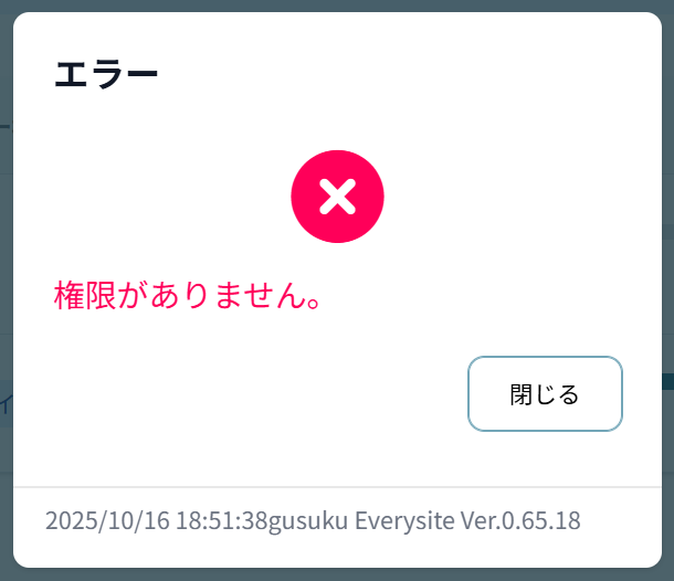 表示権限が無かった場合は、サイト権限設定やページ権限設定、またサイト画面やページ画面などの各画面で表示するための権限が無かった場合は次のようなエラーダイアログが表示され、画面を表示する事ができなくなります。