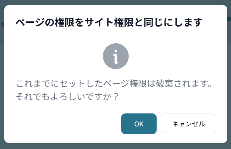 といったダイアログが表示され、OKを押すと設定していたページ権限は破棄されます。