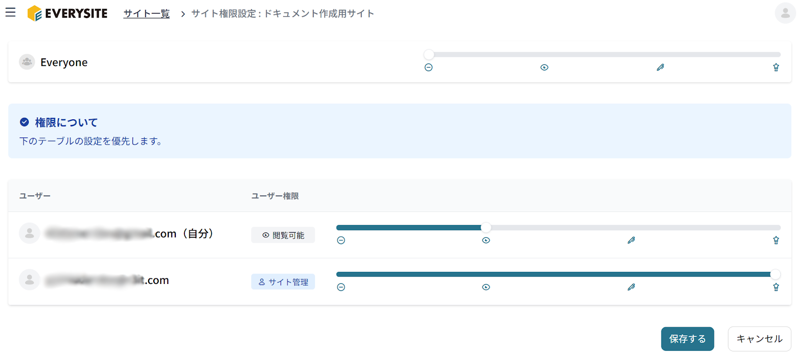 サイト権限設定画面では、サイトの単位での権限設定(サイト管理、編集可能、閲覧可能、権限無し、Everyoneにあわせる の中からの選択)を行えます。
