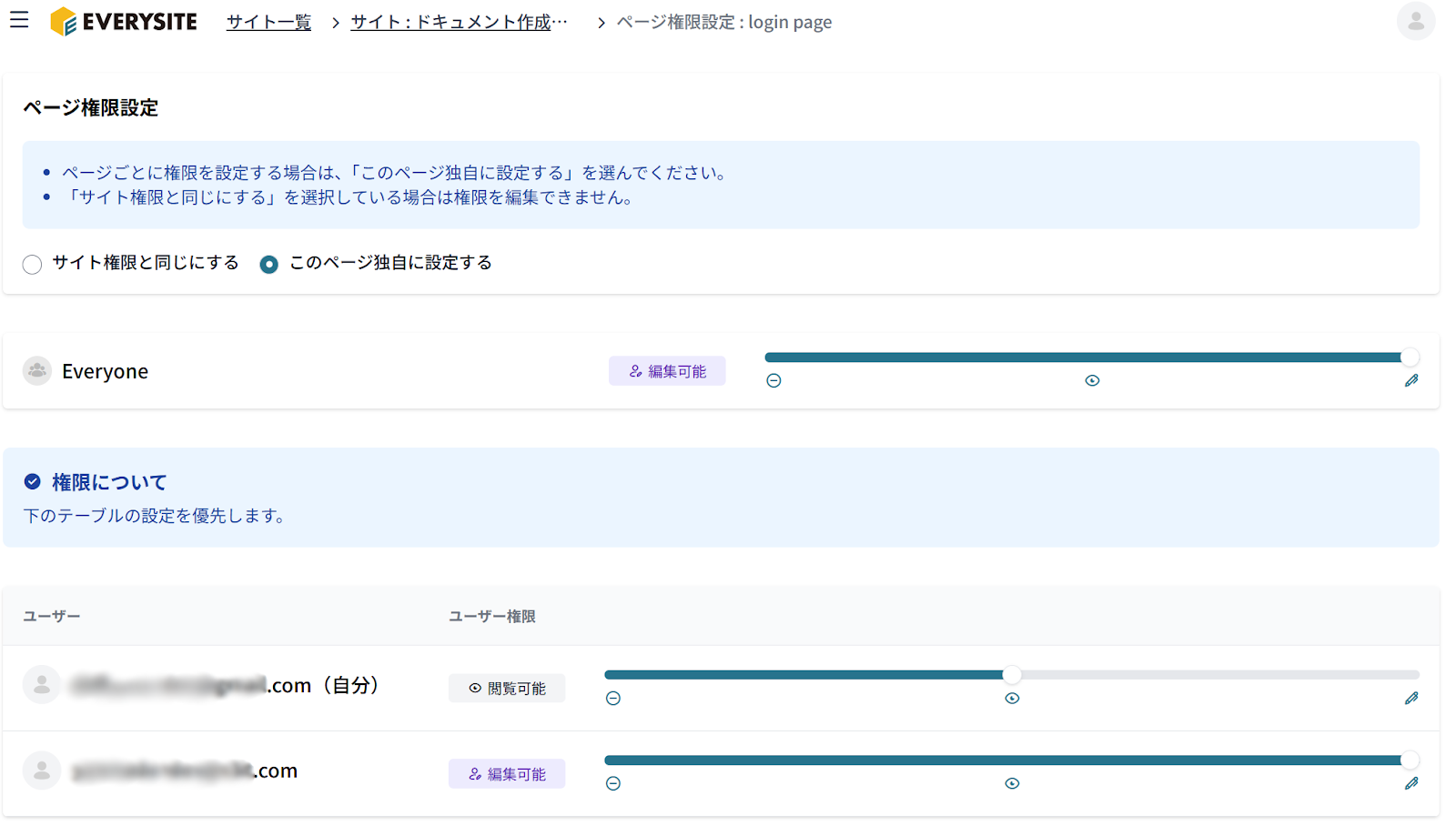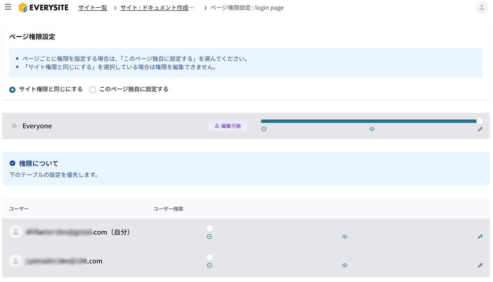 という2つの画面で、エブリサイト上で誰がどのサイト、ページを閲覧や編集できるのか? といった権限をコントロールすることができます。