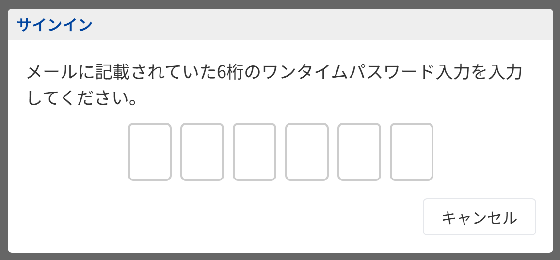 すると、入力したメールアドレスに対しメールが送信され、画面は次のようなワンタイムパスワード入力画面になります。