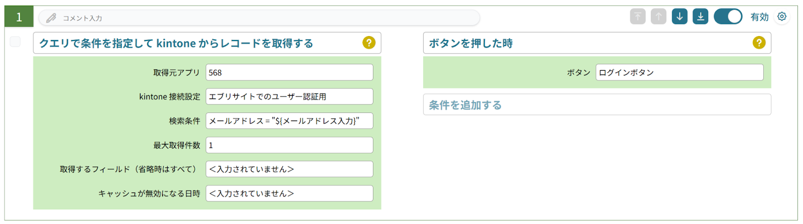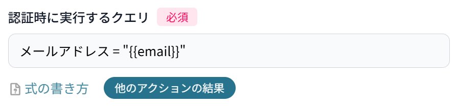検索条件:画面に入力されたメールアドレスに対応するレコードを対象とします。そのため、次のように設定します。