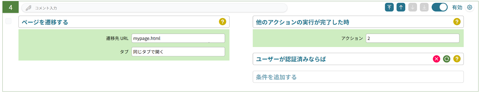 やること「ページを遷移する」、条件「他のアクションの実行が完了した時」「ユーザーが認証済みならば」を使います。