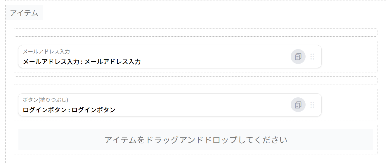 これらを左から探して、中央下部の「アイテム」のエリアにドラッグアンドドロップします(一覧で探してもよいですし、上の「キーワードを検索」で絞り込んでも良いでしょう)。