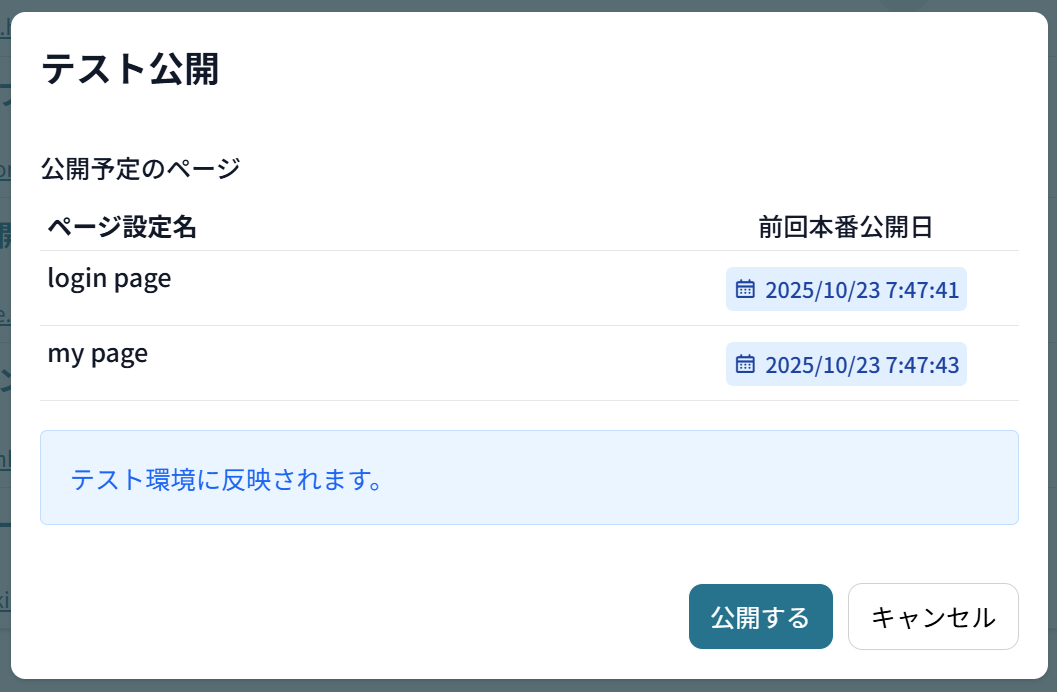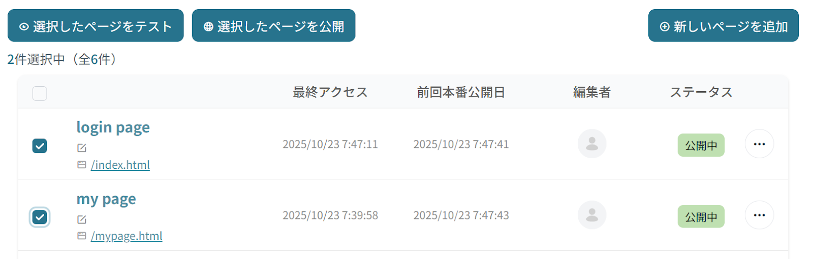 そのため、やること「ページを遷移する」などで相互に行き来するページを行き来しながら試したい場合は、対象となるページをすべて選択し、テスト実行や、ページ公開する必要があります。