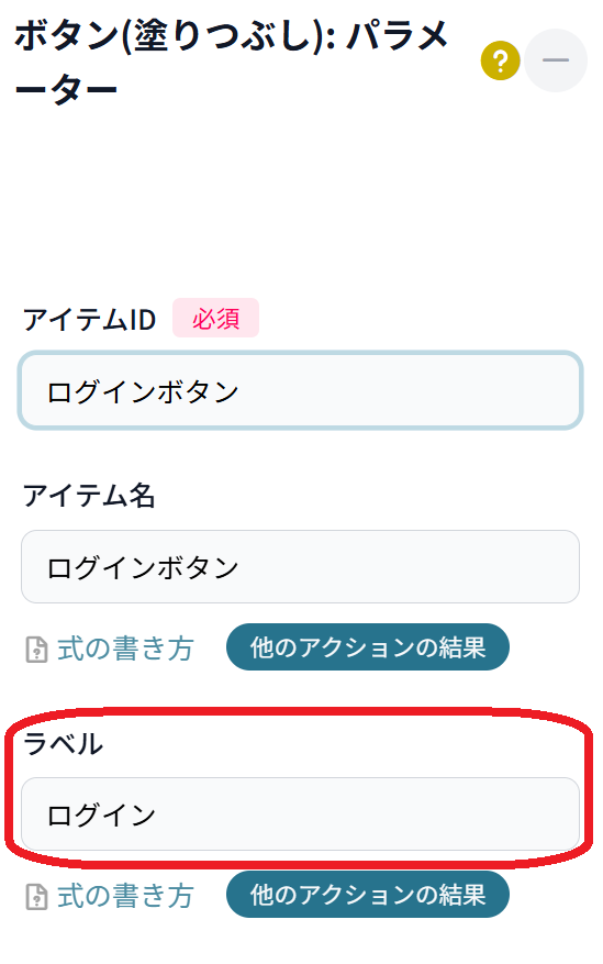 また、アイテム「ボタン(塗りつぶし) 」 にはボタンのラベルを設定する箇所があるので、こちらも忘れずに設定しておきましょう(設定しないとボタンの中に文字が入らない形でのボタンとなります)。ボタンのラベルには「ログイン」とだけ入力します。
