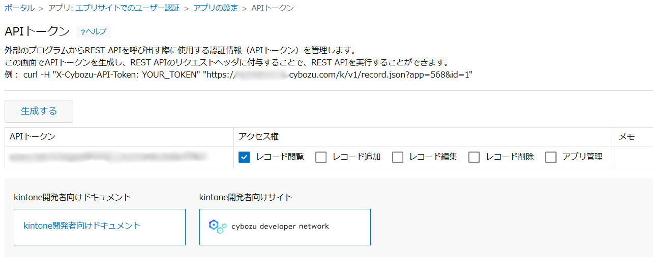 また、接続設定を行うためにAPIトークンが必要となるので、これも定義しておきましょう。アクセス権は「レコード閲覧」を指定しておいてください。