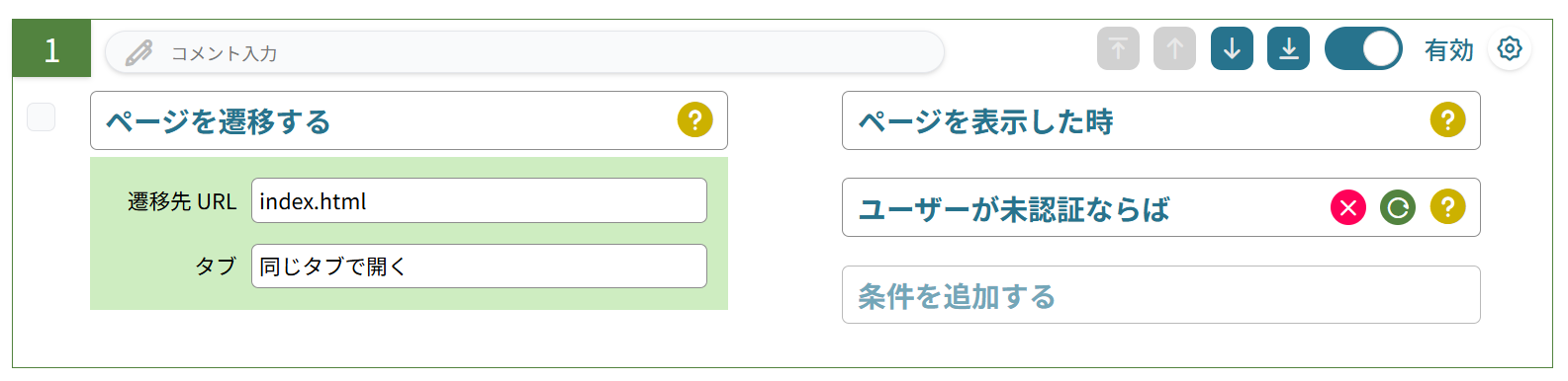 やること「ページを遷移する」、条件「ページを表示した時」「ユーザーが未認証ならば」を使います。