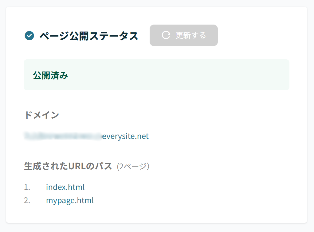 「ページ公開ステータスを確認」をクリックすると、ページが公開されていればURLの一覧が表示されます(表示されない場合は、しばらく待ってから「更新する」をクリックしてください)。