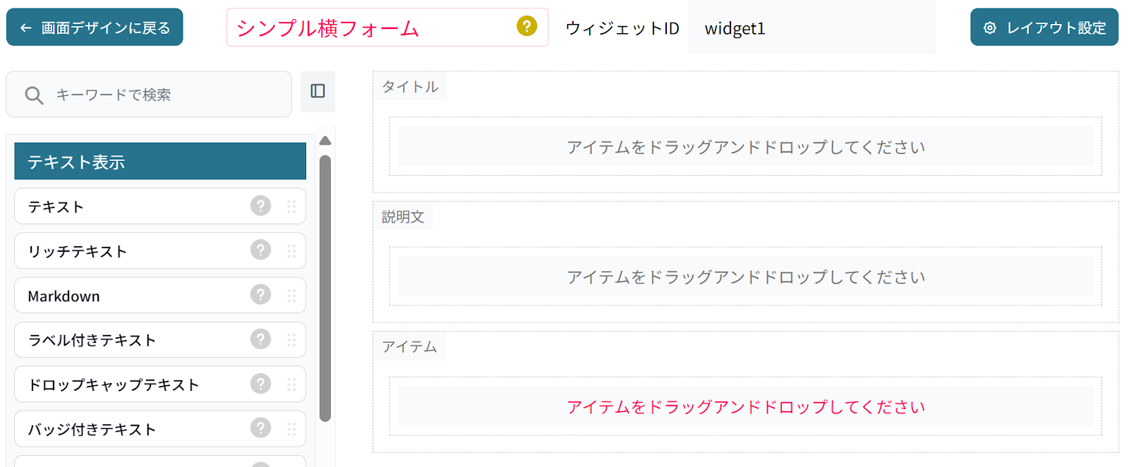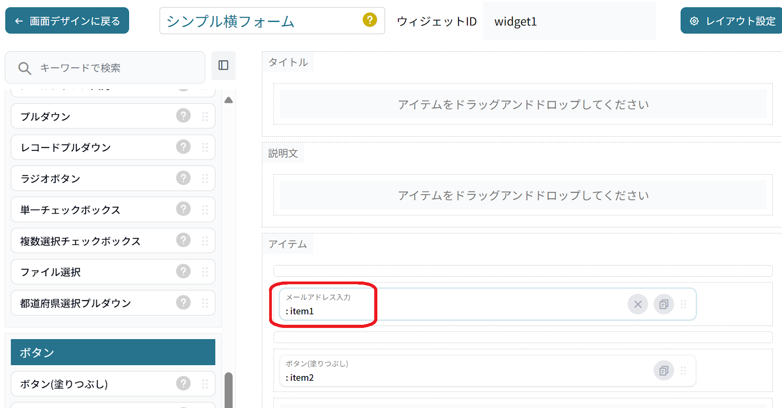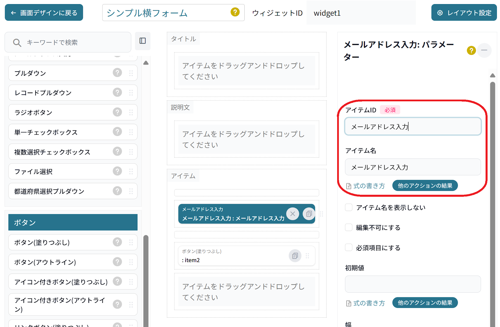 アイテムをウィジェットに設定した直後は、アイテムIDやアイテム名はitem1などの自動でついたIDや名前になるため、後に設定するページ内処理で何のアイテムかわかるよう、わかりやすい名前に変更しておきましょう。