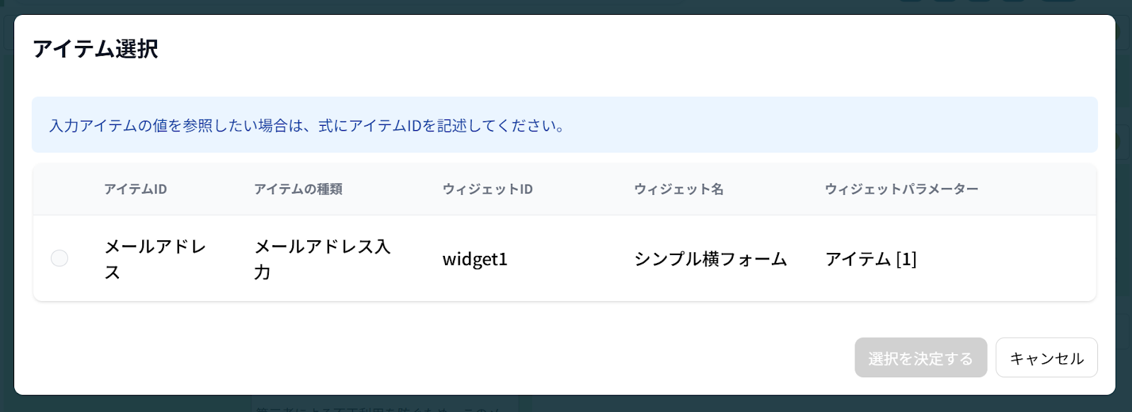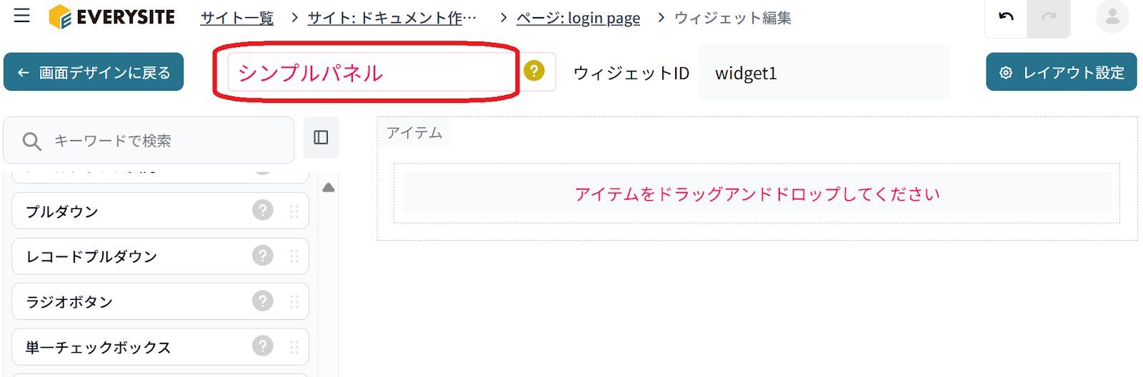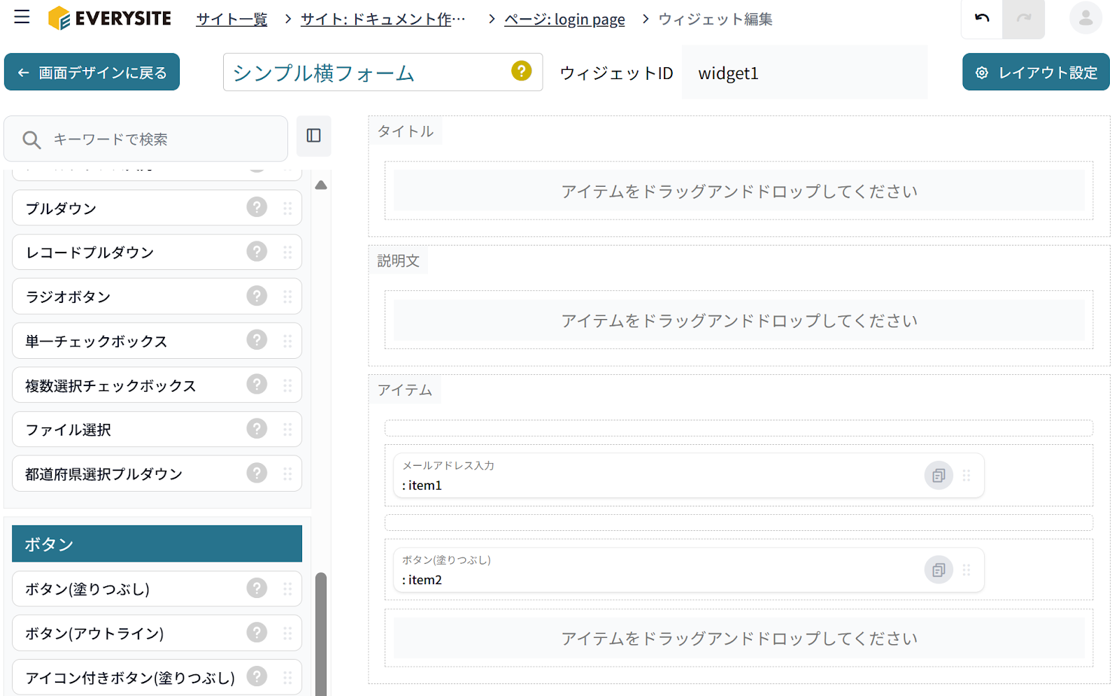 アイテムをウィジェットに設定した直後は、アイテムIDやアイテム名はitem1などの自動でついたIDや名前になるため、後に設定するページ内処理で何のアイテムかわかるよう、わかりやすい名前に変更しておきましょう。