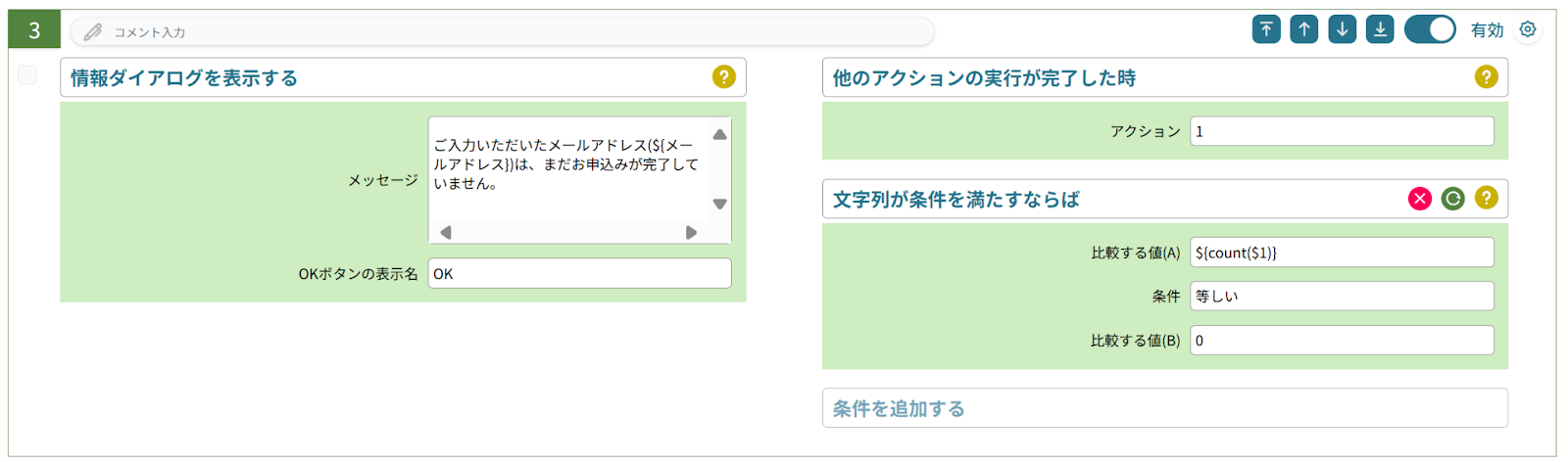 やること「情報ダイアログを表示する」、条件「他のアクションの実行が完了した時」「文字列が条件を満たすならば」を使います。