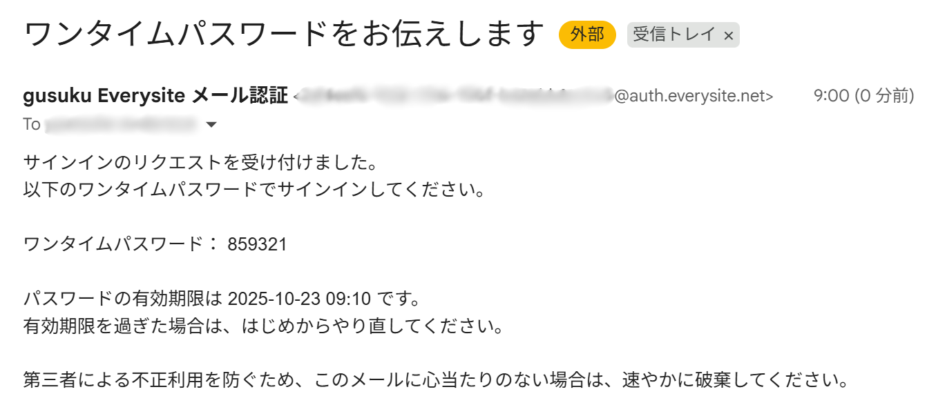 次のようなメールが来ているはずなので、ワンタイムパスワードを画面に入力しましょう。