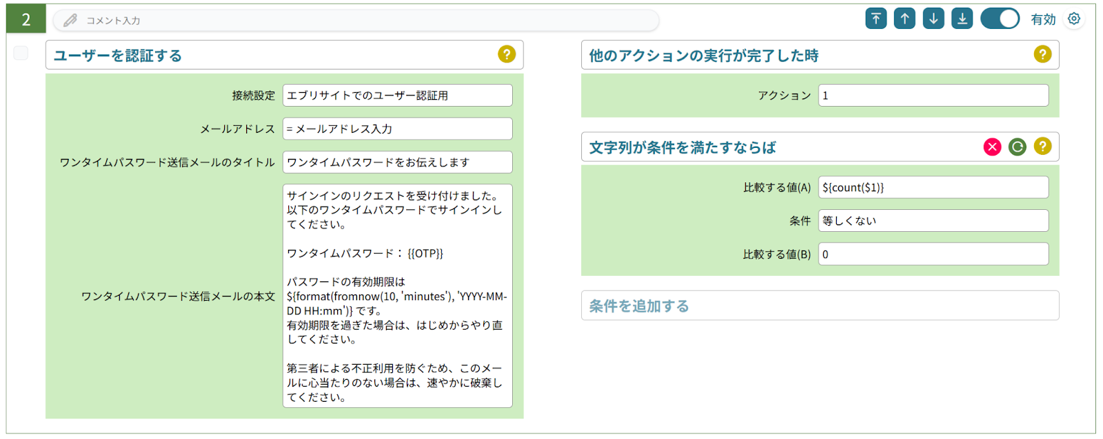 また、条件「ユーザーが認証済みならば」を設定していないと、3番アクションのワンタイムパスワード入力の際にキャンセルなどを行ってもページが遷移してしまう動きとなりますので、必ず設定するようにしてください。