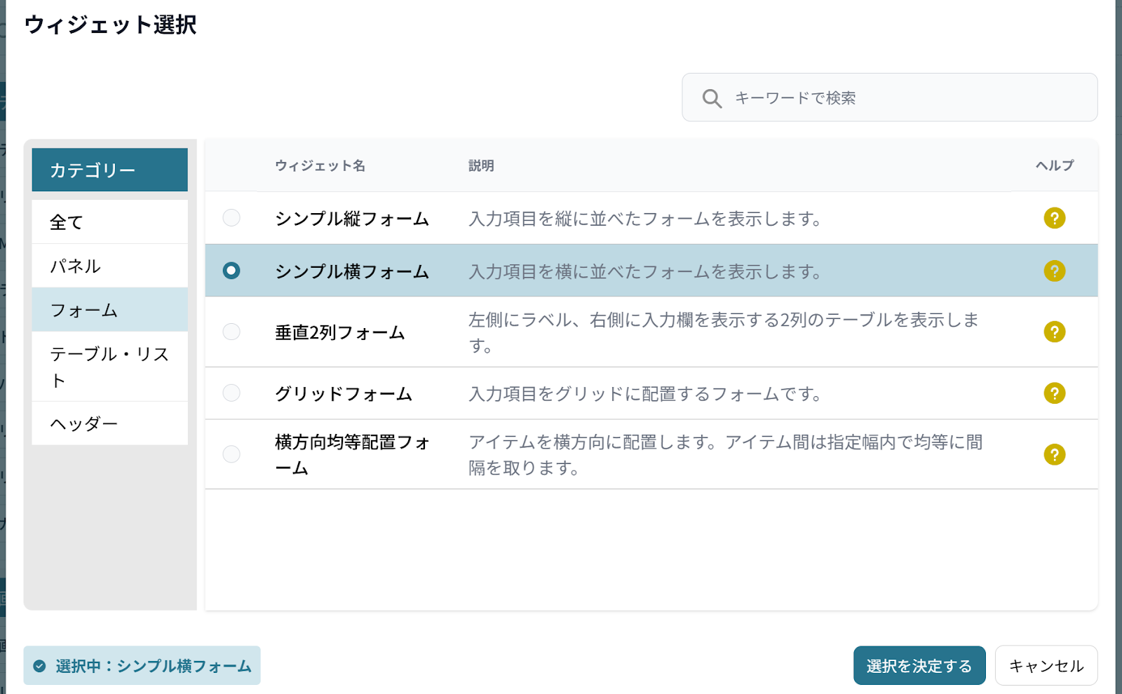 「フォーム」の「シンプル横フォーム」を選択して、「選択を決定する」をクリックしてください。