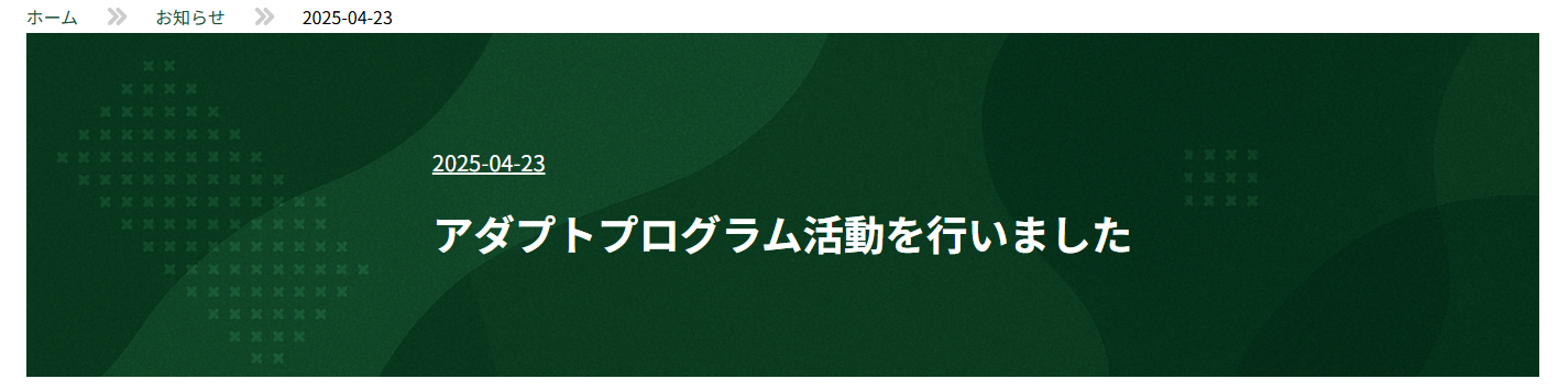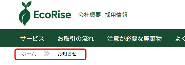 このページの場合、ひとつ前のページになる「ホーム」はリンク、「お知らせ」は今いるページですのでリンクではなくテキストで設定しておきます。