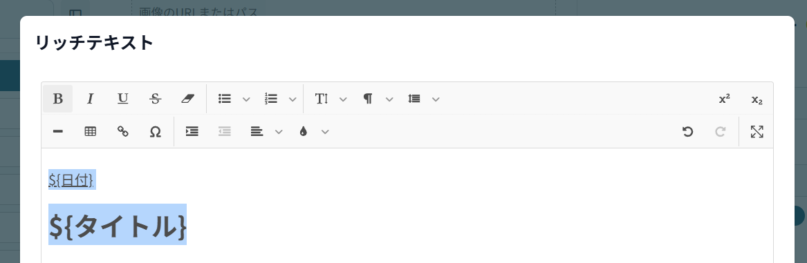 リッチテキストの文字色が白(#FFFFFF)なので見えませんが、下記のように日付フィールドとタイトルフィールドの値を表示するように設定しています。